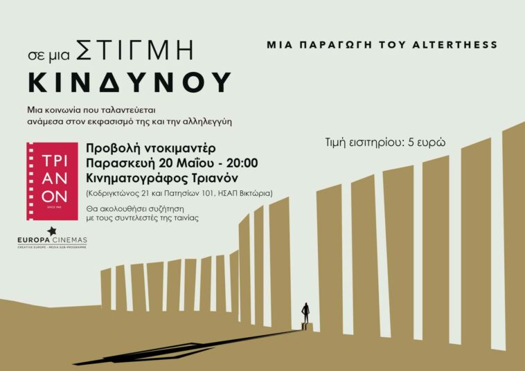 Στον Κινηματογράφο Τριανόν στην Αθήνα (Κοδριγκτώνος 21 και Πατησίων 101, ΗΣΑΠ Βικτώρια) θα πραγματοποιηθεί την Παρασκευή 20 Μαΐου στις 20:00 η πρώτη προβολή του ντοκιμαντέρ παραγωγής του Alterthess, «Σε μια στιγμή κινδύνου» – Μια κοινωνία που ταλαντεύεται ανάμεσα στον εκφασισμό της και την αλληλεγγύη.