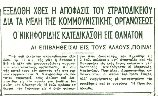 Παρ’ όλα αυτά, το έκτακτο στρατοδικείο Θεσσαλονίκης, με την απόφαση που εκδίδει στις 24 Φεβρουαρίου 1951, επιβάλλει την ποινή του θανάτου στον Νίκο Νικηφορίδη, ισόβια δεσμά στους συγκατηγορουμένους του Δούκα και Δαμιανίδη και ποινές κάθειρξης από 16 έως 4 χρόνια σε άλλους 10 νεαρούς φίλους της ειρήνης.