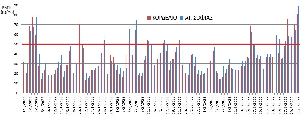 Φέτος, η δημοσίευση μετρήσεων σταμάτησε την 1η Απριλίου, μετά από συνεχόμενες μέρες που οι τιμές των PM10 ήταν σταθερά πάνω από το όριο των 50 μg/m3 μέσα στους 3 πρώτους μήνες. Οι μέρες του έτους κατά τις οποίες οι τιμές είχαν υπερβεί το όριο στους σταθμούς της Αγ. Σοφίας και του Κορδελιού αντίστοιχα ήταν 18 και 15 από τις 35 συνολικά που συνιστούν παράβαση. Και όλα αυτά μόνο μέσα στο πρώτο τρίμηνο του 2022» αναφέρεται στην ανακοίνωση της Πρωτοβουλίας.