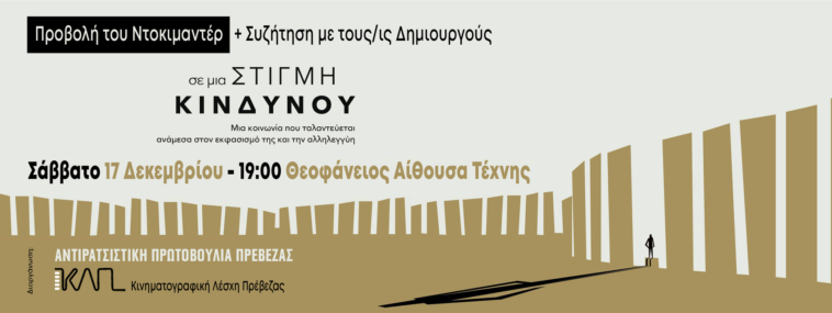 Η Αντιρατσιστική Πρωτοβουλία Πρέβεζας σε συνεργασία με την Κινηματογραφική Λέσχη Πρέβεζας διοργανώνουν προβολή του ντοκιμαντέρ « Σε μια στιγμή κινδύνου», το Σάββατο 17 Δεκεμβρίου 2022 στις 19:00 στην Θεοφάνειο Αίθουσα Τέχνης (Εθν. Αντίστασης και Θεοφάνους) με είσοδο ελεύθερη.
