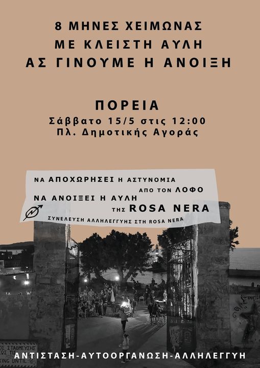 Η Συνέλευση Αλληλεγγύης στην Κατάληψη Rosa Nera καλεί τις ομάδες και φορείς της πόλης σε πορεία το ερχόμενο Σάββατο με κεντρικά αιτήματα την αποχώρηση της αστυνομίας από το Λόφο Καστέλι και το άνοιγμα της αυλής.