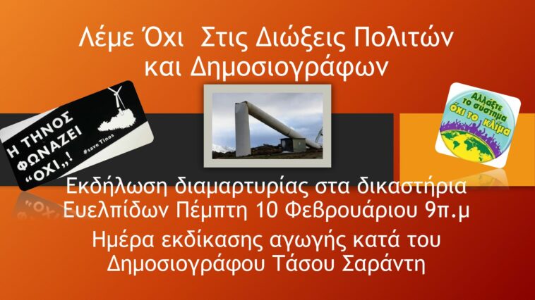 «Αγωγές και μηνύσεις σε πολίτες που αντιστέκονται, αγωγές και μηνύσεις σε δημοσιογράφους που γράφουν για την καταστροφή του περιβάλλοντος. Η παραγωγή τέτοιου είδους αγωγών και η τακτική που ακολουθούν όλες οι «πράσινες» εταιρίες είναι πανομοιότυπες. Ανάλογα τέτοια περιστατικά υπάρχουν και στην Τήνο, με πάνω από εκατό αγωγές σε πολίτες που αντιστάθηκαν στην εγκατάσταση αιολικών πάρκων.