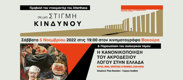Προβολή του ντοκιμαντέρ του Alterthess «Σε μια στιγμή κινδύνου» και παρουσίαση του συλλογικού τόμου «Η Κανονικοποιήση του Ακροδεξιού Λόγου στην Ελλάδα – Φύλο, ΜΜΕ, Ένοπλες Δυνάμεις, Εκκλησία» (Επιμ. Ρ. Βασιλάκη – Γ. Σουβλής) διοργανώνει το Ίδρυμα Ρόζα Λούξεμπουργκ – Παράρτημα Ελλάδας, σήμερα, Σάββατο 5 Νοεμβρίου 2022 στις 19:00 το απόγευμα στον κινηματογράφο Βακούρα (Μιχαήλ Ιωάννου 8, Θεσσαλονίκη 546 22).
