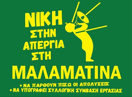 Σε συγκέντρωση αλληλεγγύης στα δικαστήρια καλεί την Παρασκευή 4 Νοεμβρίου το Σωματείο των εργαζομένων στη Μαλαματίνα, καθώς εκδικάζεται η νέα προσφυγή της νέας εργοδοσίας της επιχείρησης εναντίον των εργαζόμενων απεργών και των απολυμένων. Η εργοδοσία της Μαλαματίνα κατέθεσε ασφαλιστικά μέτρα προκειμένου να απαγορεύσει να φορούν οι εργαζόμενοι τα πράσινα μπλουζάκια σύμβολο της απεργίας, να τους επιβληθεί μεγάλο πρόστιμο (5.000 ευρώ – ένα μήνα φυλάκιση) κ.λπ.