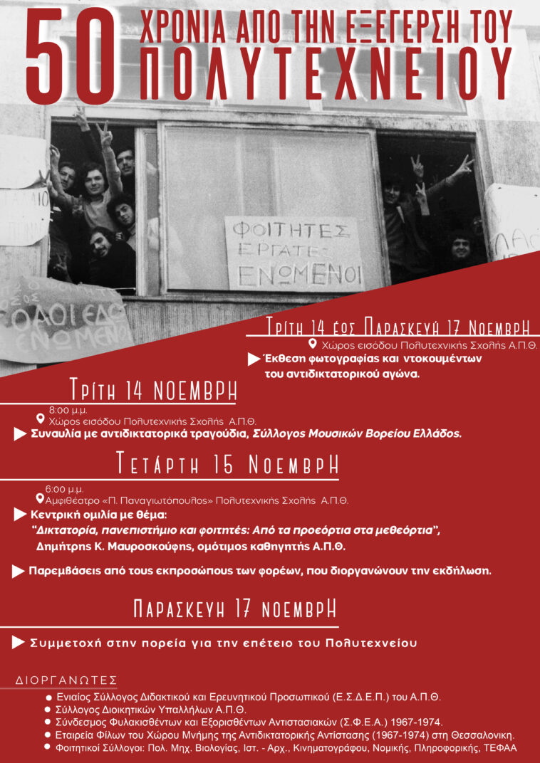 Την Τετάρτη 15 Νοεμβρίου στις 6 μμ στο αμφιθέατρο “Π.Παναγιωτόπουλος” της Πολυτεχνικής Σχολής του ΑΠΘ θα υπάρξει κεντρική ομιλία από τον ομότιμο καθηγητή ΑΠΘ Δημήτρη Μαυροσκούφη με θέμα: “Δικτατορία, πανεπιστήμιο και φοιτητές: Από τα προεόρτια στα μεθεόρτια”.