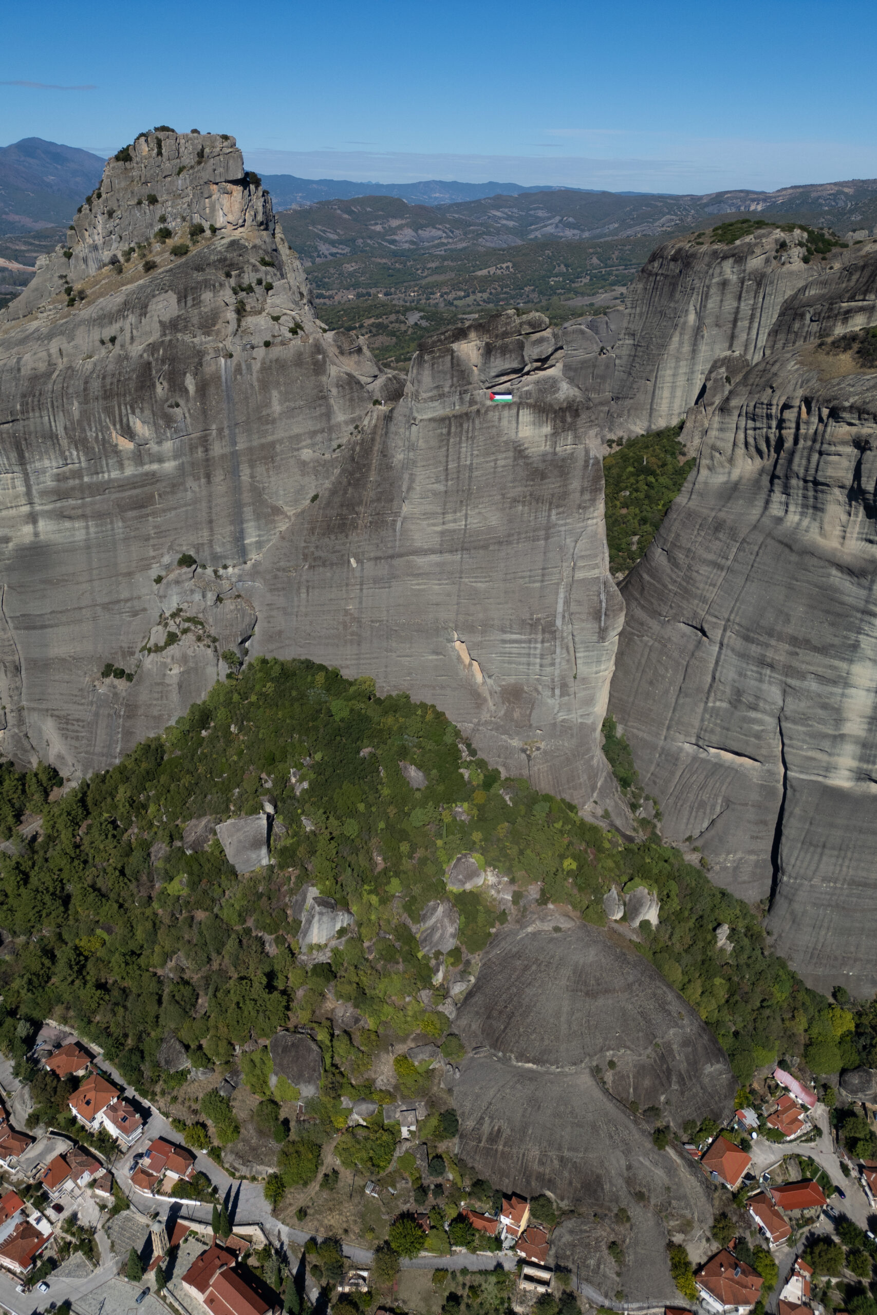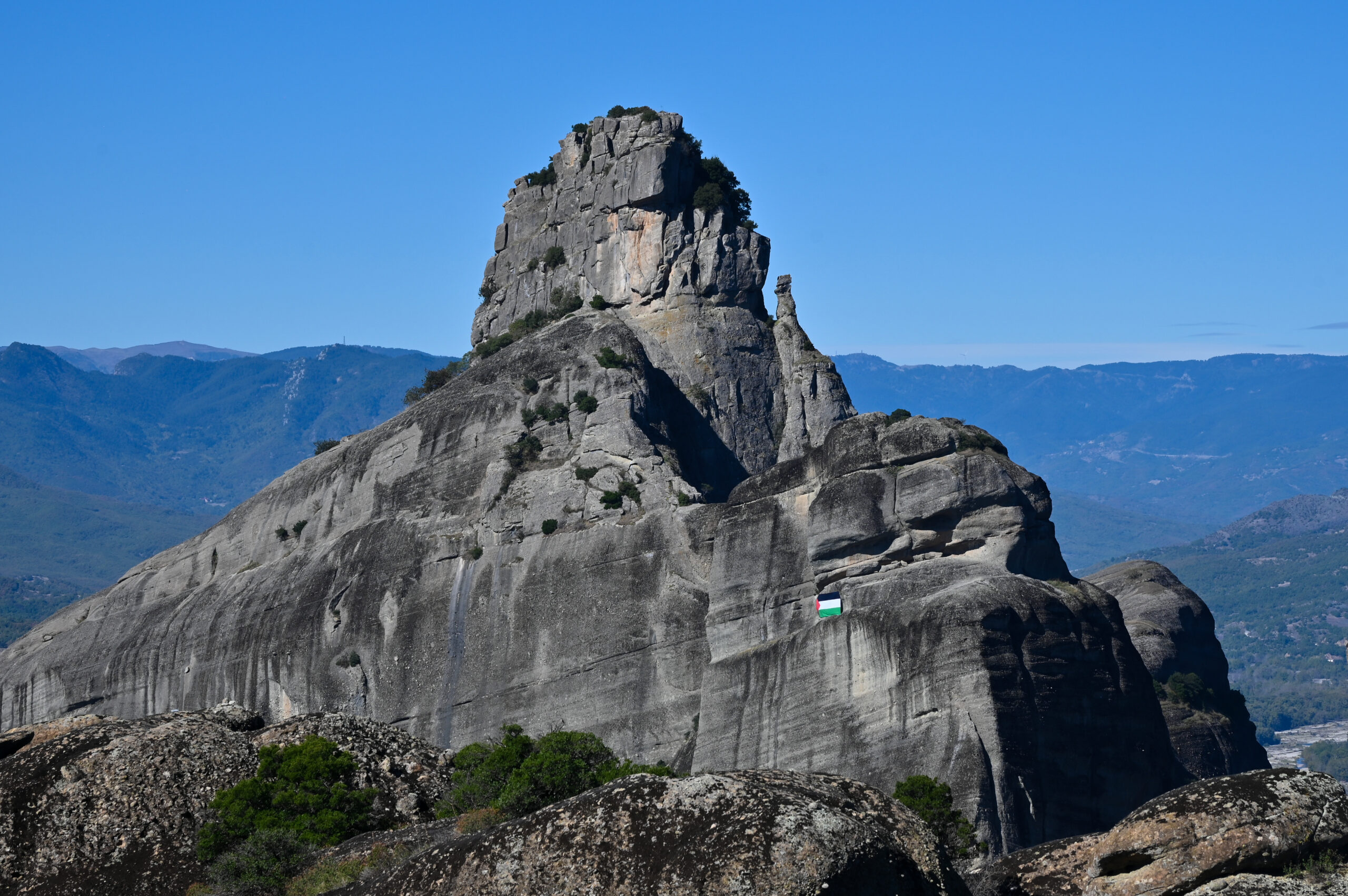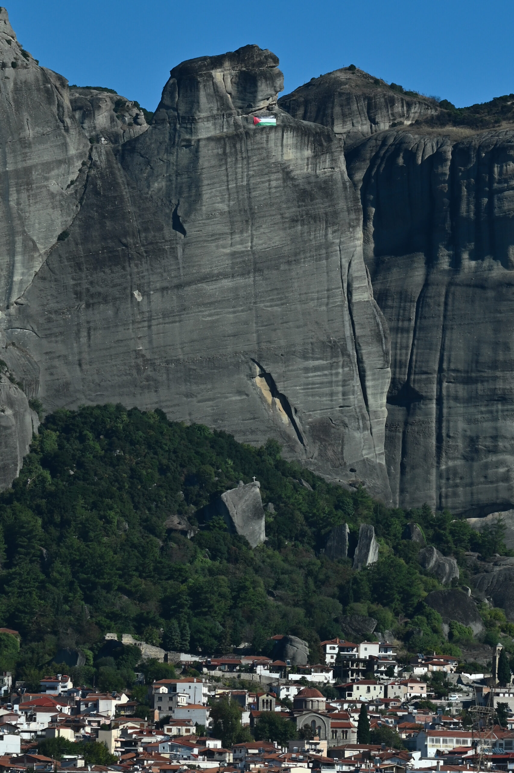Ηχηρό μήνυμα να σταματήσει η γενοκτονία στη Γάζα έστειλαν αλληλέγγυοι-ες στην Παλαιστίνη αναρτώντας γιγαντιαία σημαία της Παλαιστίνης σε βράχο των Μετεώρων. Η σημαία είναι ορατή από την πόλη της Καλαμπάκας.