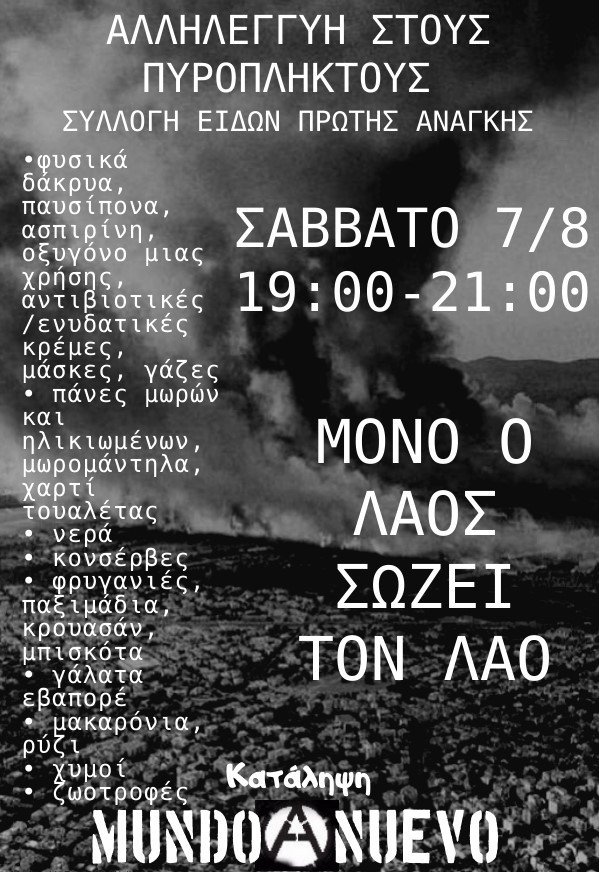 Συλλογή ειδών πρώτης ανάγκης για τους πυρόπληκτους θα πραγματοποιηθεί το Σάββατο 7 Αυγούστου από τις 19.00 ως τις 21.00 στην κατάληψη Mundo Nuevo, Φιλίππου με Σιατίστης. «Η αλληλεγγύη όπλο της κοινωνίας, μόνο ο λαός σώζει τον λαό» αναφέρουν οι καταληψίες.