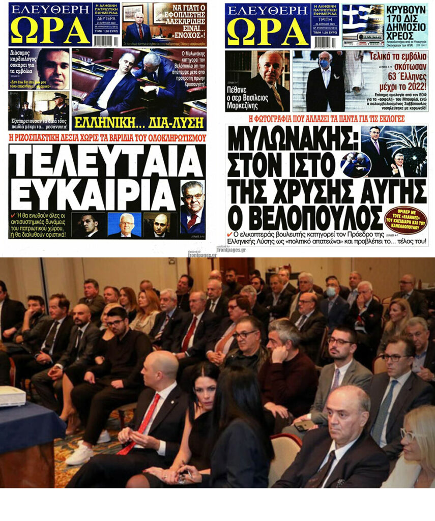 Η «Ελεύθερη Ωρα» κάνει έκκληση για ενότητα των «αντισυστημικών» ακροδεξιών (Κασιδιάρη, Κανελλόπουλου, Μπογδάνου και Εμφιετζόγλου), αποκλείοντας τον Κυριάκο Βελόπουλο. Την επόμενη μέρα «καρφώνει» τον δημοσιογράφο Αρη Σπίνο, όψιμο υποστηρικτή του Βελόπουλου, ως «δάκτυλο» της Χρυσής Αυγής στην Ελληνική Λύση (25.4.2023). Πάνω, στιγμιότυπο από την εκδήλωση του Ομίλου DNM Group, του Τάσου Γκουριώτη, στο ξενοδοχείο Μεγάλη Βρεταννία, στις 16.2.2023