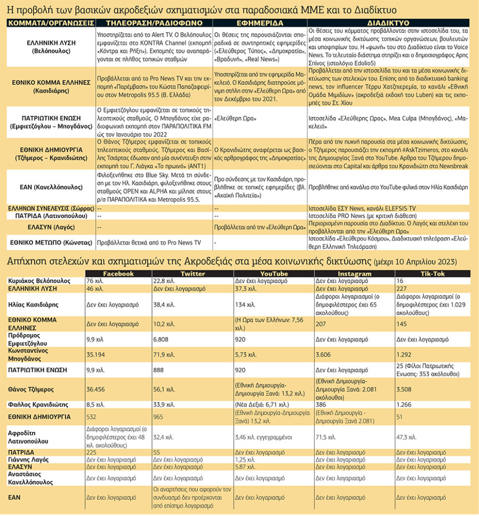 Αναμενόμενα, για προσωποπαγή κόμματα, η απήχηση των ηγετικών στελεχών της Ακροδεξιάς είναι πολλαπλάσια αυτής των κομμάτων. Χαρακτηριστική εδώ είναι η δημοφιλία της Αφροδίτης Λατινοπούλου σε facebook, Instagram και TikTok, η ταύτιση των προσωπικών λογαριασμών του Πρ. Εμφιετζόγλου με τους λογαριασμούς της «Πατριωτικής Ενωσης» και η σχεδόν αδιάφορη παρουσία της νεοϊδρυθείσας «Εθνικής Δημιουργίας» συγκριτικά με τη μεγαλύτερη επιρροή των προσωπικών λογαριασμών των Τζήμερου και Κρανιδιώτη.