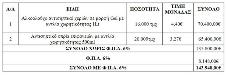 144.044,80 ευρώ για χλωρίνες και απορρυπαντικά