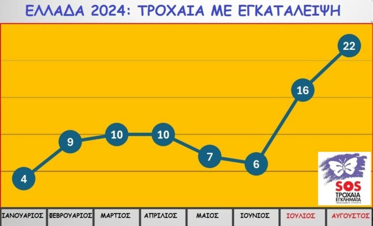 Παραθέτουμε (ΕΔΩ) 38 περιστατικά τροχαίων με εγκατάλειψη που καταγράψαμε το δίμηνο Ιουλίου – Αυγούστου 2024, όταν το πρώτο εξάμηνο του έτους είχαμε καταγράψει 46. Από 8 περίπου περιστατικά ανά μήνα το πρώτο εξάμηνο φτάσαμε στα 19 ανά μήνα (μέσος όρος) το τελευταίο δίμηνο!