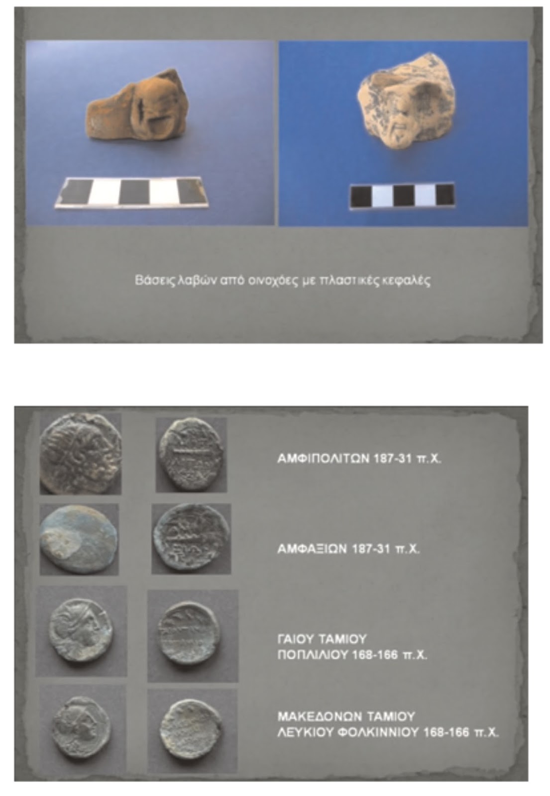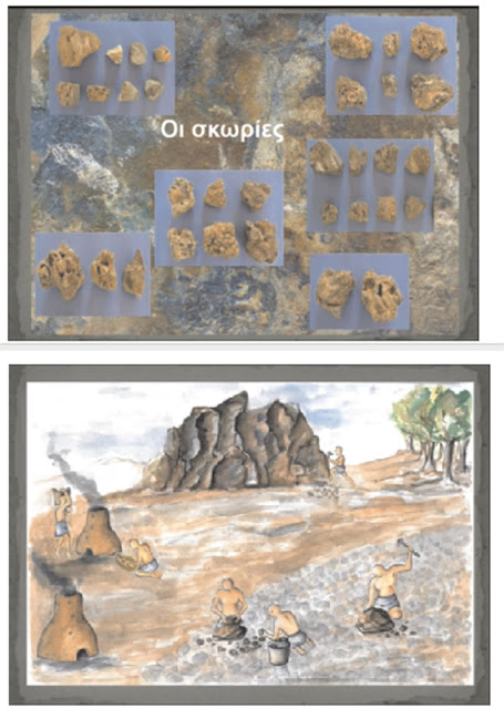 Σημείωση: Οι εικαστικές αποτυπώσεις όπως η παραπάνω, που περιλαμβάνονται στις διαφάνειες παρουσίασης της ανασκαφικής έρευνας, υποβαθμίζουν -τεχνηέντως;- τη σημασία του χώρου αρχαίας μεταλλουργίας χαλκού στη θέση Σκουριές. Απουσιάζει τελείως το πολιτισμικό υπόβαθρο που αποκαλύφθηκε στην ανασκαφή (κτίριο, έργα υποδομής, ανθρώπινη εγκατάσταση) με σκοπό να παρουσιαστεί ως ιδιαίτερα προσωρινή και όχι ως οργανωμένη εγκατάσταση, στα δεδομένα του 2ου αι. π.Χ.