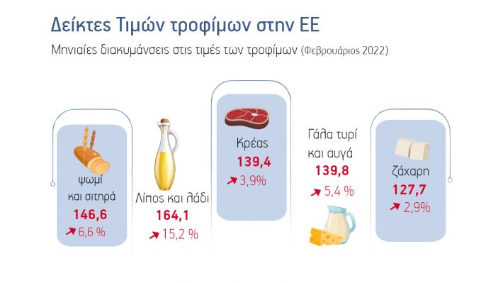 Στην ΕΕ, οι τιμές εκτινάσσονται. Κατά 4,1% τον Φεβρουάριο αυξήθηκαν οι τιμές των τροφίμων, του αλκοόλ και του καπνού, ενώ ήδη τον Ιανουάριο είχαν καταγράψει αύξηση 3,5%. Ο παγκόσμιος δείκτης τιμών των τροφίμων έφτασε σε υψηλό όλων των εποχών τον Μάρτιο του τρέχοντος έτους, το υψηλότερο από την ίδρυση του FAO το 1990, ανέφερε Ο Οργανισμός Τροφίμων και Γεωργίας του ΟΗΕ (FAO).
