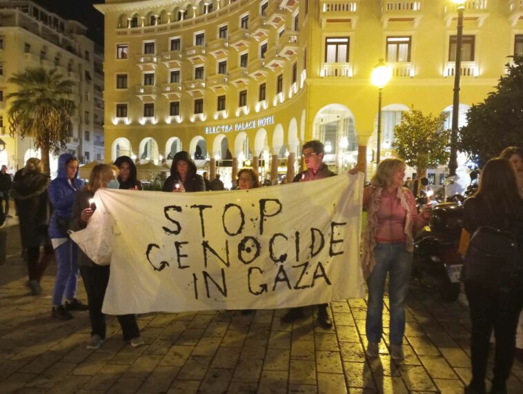 Με ένα πανό που έγραφε «Stop Genocide in Gaza» και με λίγα κεριά στα χέρια ενεργοί πολίτες της Θεσσαλονίκης βρέθηκαν το βράδυ της Κυριακής έξω από το κτίριο του Ολύμπιον όπου ήταν σε εξέλιξη το Φεστιβάλ Κινηματογράφου.