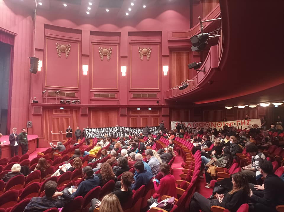 Μέλη του κινήματος ενάντια στις εξορύξεις ανάρτησαν πανό μέσα στην αιθούσα κατά τη διάρκεια της συζήτησης «Καμιά αποδοχή-καμιά συναίνεση, χρυσωρυχεία ποτέ και πουθενά» αλλά και από το μπαλκόνι του Ολύμπιον.
