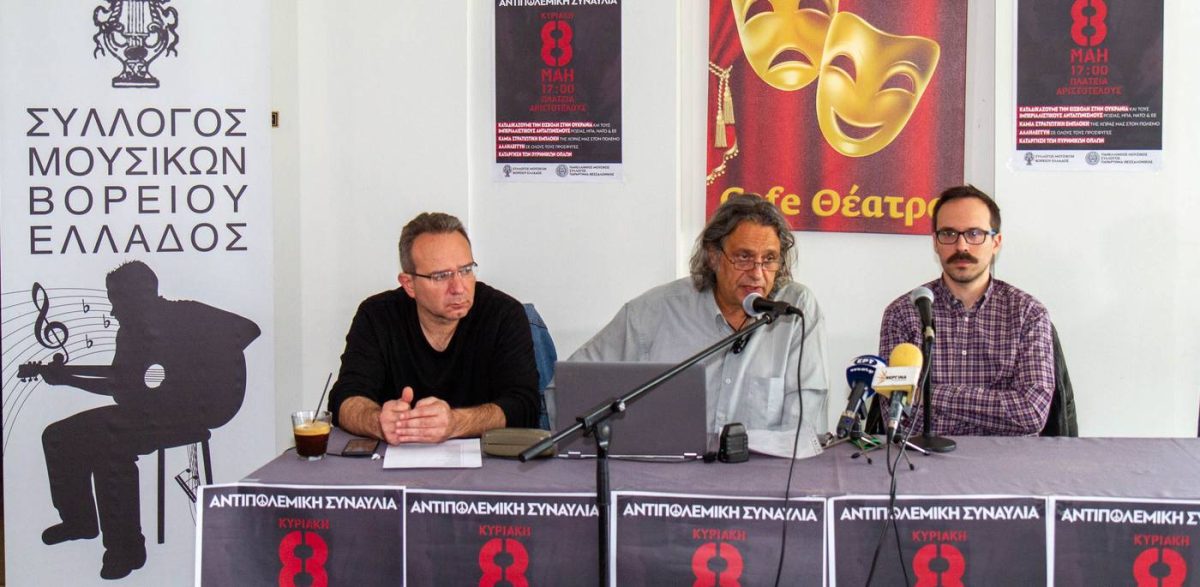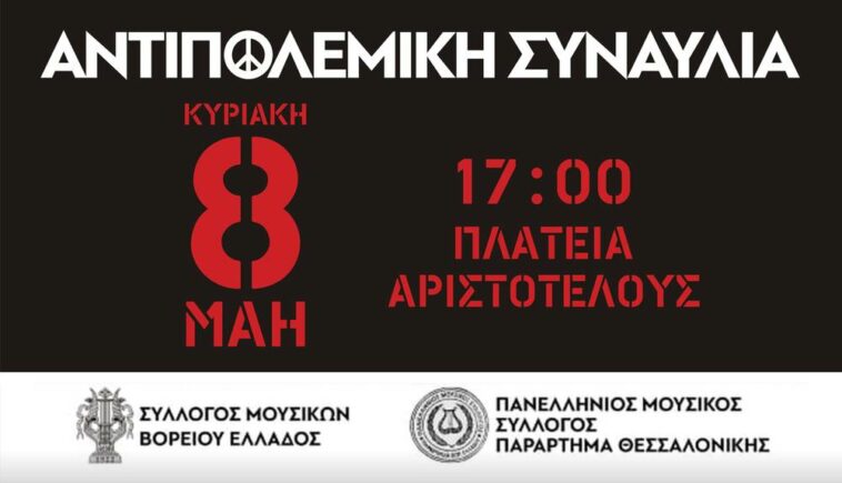 Ανακοινώθηκαν τα ονόματα των συμμετεχόντων στη μεγάλη αντιπολεμική συναυλία της 8ης Μάη, που διοργανώνουν στην πλατεία Αριστοτέλους ο Σύλλογος Μουσικών Βορείου Ελλάδος (ΣΜΒΕ) και ο Πανελλήνιος Μουσικός Σύλλογος (ΠΜΣ), κατά τη διάρκεια συνέντευξης τύπου.