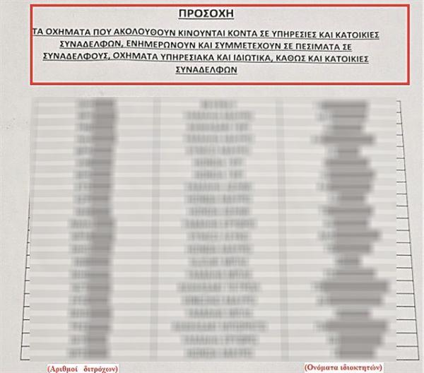 Το Σάββατο 27 Μαρτίου ενημερωθήκαμε από το in.gr και το άρθρο του Βασίλη Λαμπρόπουλου πως τα οχήματα μας και κατά συνέπεια εμείς, ανήκουμε σε ανεπίσημη λίστα υπόπτων «που κινούνται κοντά σε υπηρεσίες και σπίτια συναδέλφων και ενημερώνουν ή συμμετέχουν σε πεσίματα (!!!) σε συναδέλφους, οχήματα υπηρεσιακά και ιδιωτικά καθώς και σε κατοικίες τους».
