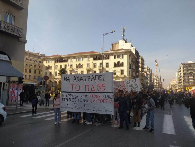 Με αίτημα την απόσυρση του Προεδρικού Διατάγματος 85 και την κατοχύρωση των τίτλων σπουδών των καλλιτεχνικών σχολών οι σπουδάστριες και οι σπουδαστές που συμμετέχουν και στο Συντονιστικό Καλλιτεχνικών Σχολών Θεσσαλονίκης φώναξαν συνθήματα κατά της κυβέρνησης.