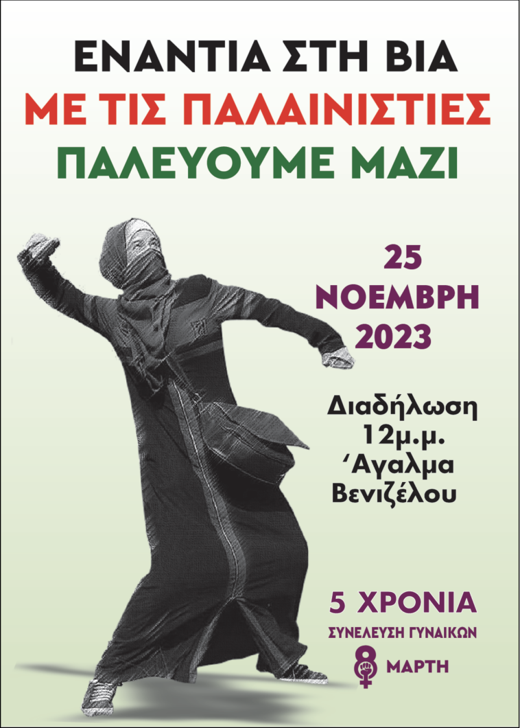 Σε διαδήλωση αλληλεγγύης στις γυναίκες της Παλαιστίνης καλεί το Σάββατο 25 Νοεμβρίου στις 12μμ στο Άγαλμα Βενιζέλου η Συνέλευση Γυναικών 8 Μάρτη, με κεντρικό σύνθημα «ενάντια στη βία με τις Παλαιστίνιες παλεύουμε μαζί». «Γιατί η εξάλειψη της βίας κατά των γυναικών δεν μπορεί να υπάρξει χωρίς την εξάλειψη της βίας στη Παλαιστίνη», συμπληρώνει.