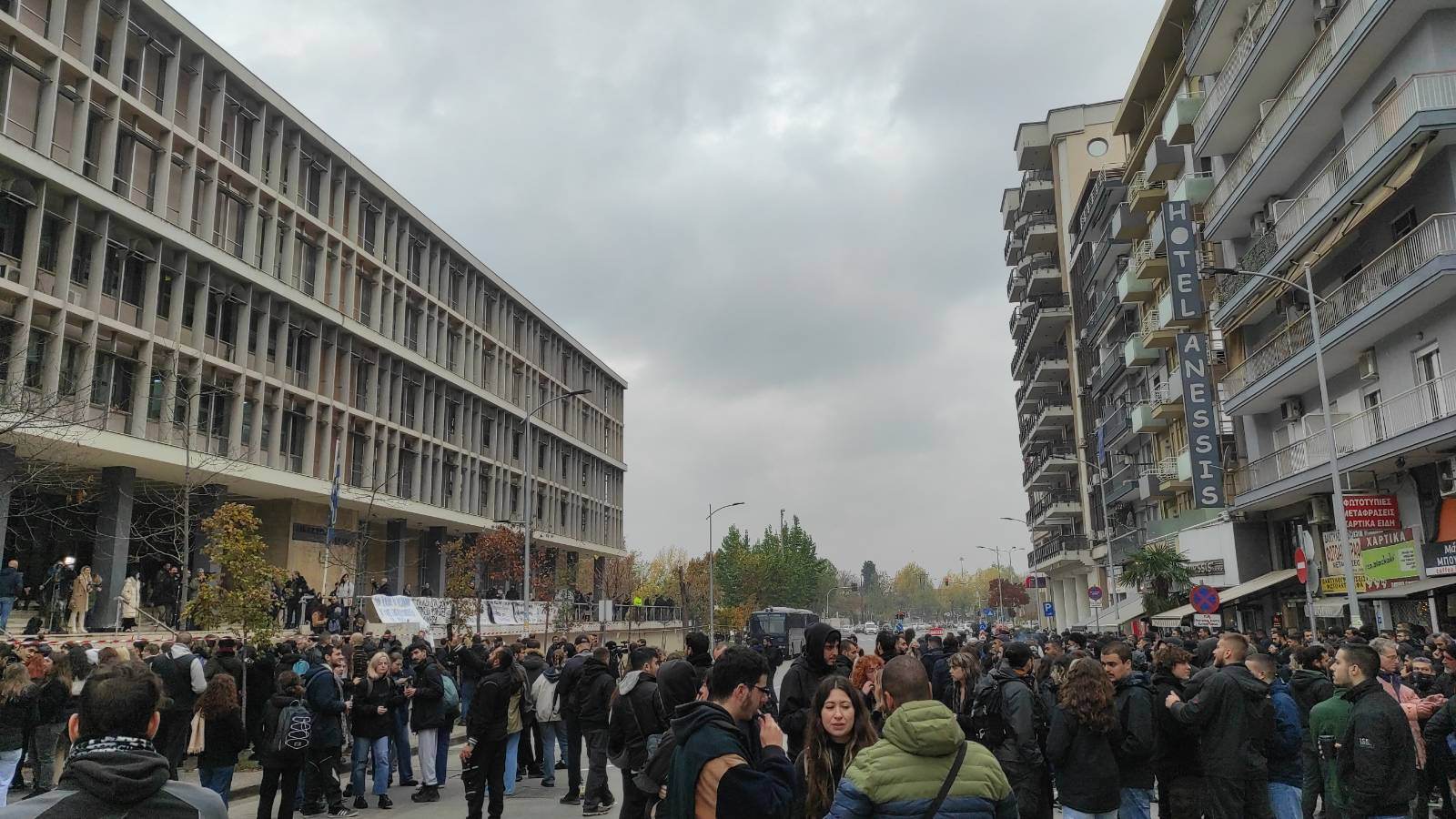 Σε εξέλιξη είναι η συγκέντρωση διαμαρτυρίας έξω από τα δικαστήρια Θεσσαλονίκης ενάντια στην αστυνομική βία με αφορμή τη σημερινή απολογία του αστυνομικού που πυροβόλησε τον 16χρονο Κώστα Φραγκούλη. Το δικαστικό Μέγαρο μοιάζει με φρούριο με ισχυρή την αστυνομική παρουσία με ΜΑΤ και ΕΚΑΜ.