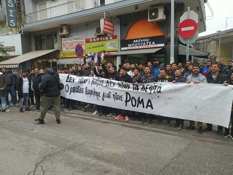 Έχοντας στα χέρια χαρτονομίσματα των 20 ευρώ τα μέλη των κοινοτήτων Ρομά φωνάζουν προς το μέρος των αστυνομικών δυνάμεων «θέλουμε δικαιοσύνη».