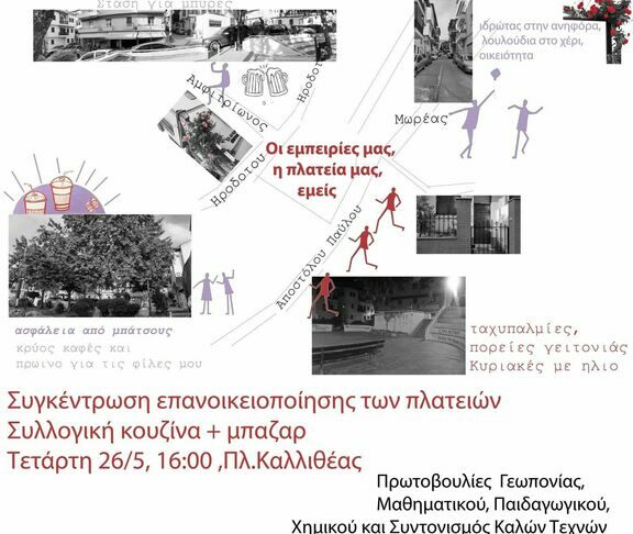 Συγκέντρωση επανοικειοποίησης των πλατειών με συλλογική κουζίνα και μπαρ θα πραγματοποιηθεί την Τετάρτη 26 Μαΐου στις 16.00 στην πλατεία Καλλιθέας στην Άνω Πόλη που τον τελευταίο καιρό υπάρχει μόνιμη παρουσία της αστυνομίας, ενώ θα υπάρχει και συλλογική κουζίνα και μπαζάρ. Την πρωτοβουλία πήραν πρωτοβουλίες φοιτητ(ρι)ών από τη Γεωπονία, το Μαθηματικό, το Παιδαγωγικό, το Χημικό και τον Συντονισμό της σχολής Καλών Τεχνών.