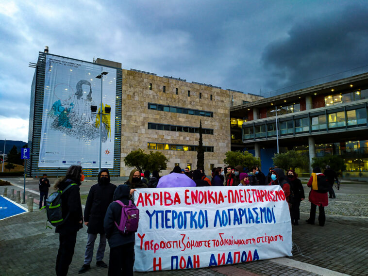 Συγκέντρωση διαμαρτυρίας έξω από το δημαρχείο Θεσσαλονίκης πραγματοποιήθηκε από πολίτες μετά από κάλεσμα του δημοτικού σχήματος «Η Πόλη Ανάποδα – Δύναμη Ανατροπής» με αίτημα την προστασία και την πρόσβαση όλων των πολιτών στην στέγαση, και ενώ ήταν σε εξέλιξη η ειδική συνεδρίαση του Δημοτικού Συμβουλίου για το θέμα.