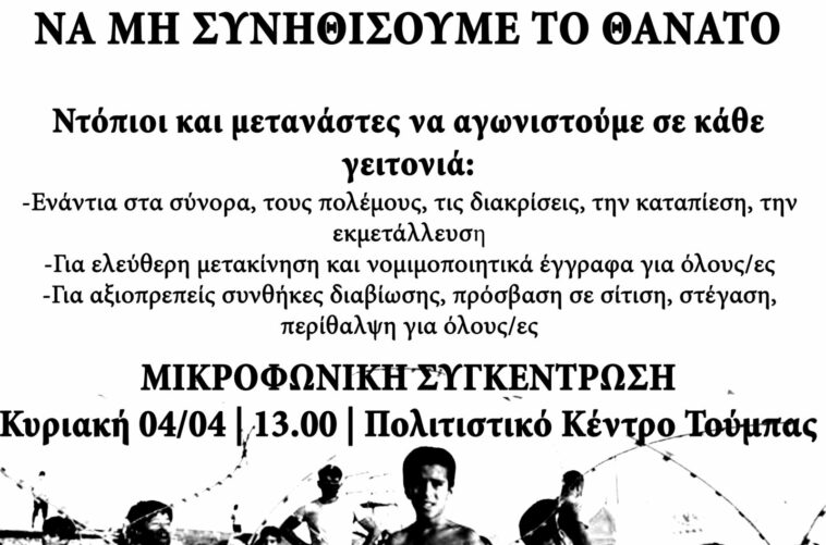 Μικροφωνική συγκέντρωση αλληλεγγύης στους μετανάστες θα πραγματοποιηθεί σήμερα, Κυριακή 4 Απρίλη, στις 13.00 στο Πολιτιστικό Κέντρο Τούμπας μετά από σχετικά καλέσματα της συλλογικότητας αναρχικών από τα ανατολικά, της κατάληψης Terra Incognita και της συνέλευσης Stop War On Migrants. Αφορμή αποτελούν τα πρόσφατα περιστατικά σε κέντρα κράτησης μεταναστών σε Κόρινθο και Κω.