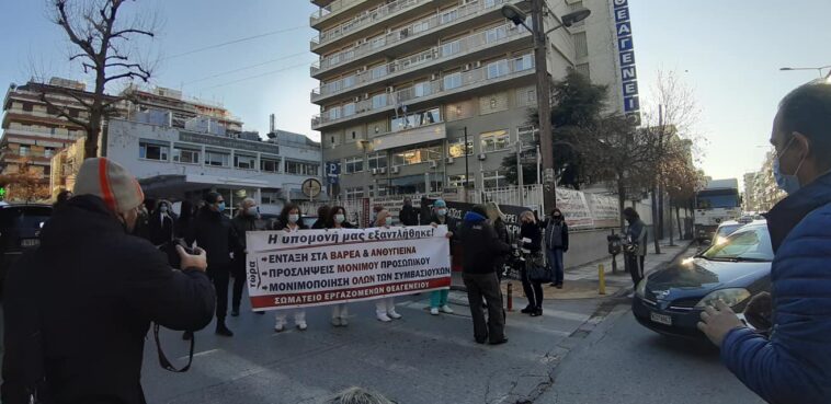 Συγκέντρωση στην είσοδο του Αντικαρκινικού Νοσοκομείου Θεσσαλονίκης Θεαγένειο πραγματοποίηθηκε σήμερα, στα πλαίσια των συντονισμένων παρεμβάσεων και κινητοποιήσεων για την Υγεία, οι οποίες κορυφώνονται με την απεργία στις 16 Φεβρουαρίου.