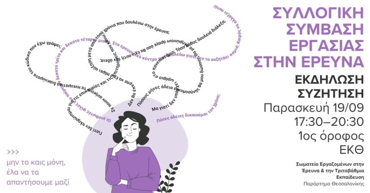 Ανοιχτή συζήτηση για τη διεκδίκηση Συλλογικής Σύμβασης Εργασίας στον χώρο της έρευνας διοργανώνει το Σωματείο Εργαζομένων στην Έρευνα και την Τριτοβάθμια Εκπαίδευση – Παράρτημα Θεσσαλονίκης, την Παρασκευή 19 Σεπτεμβρίου, στις 17:30, στο Εργατικό Κέντρο Θεσσαλονίκης (1ος όροφος).