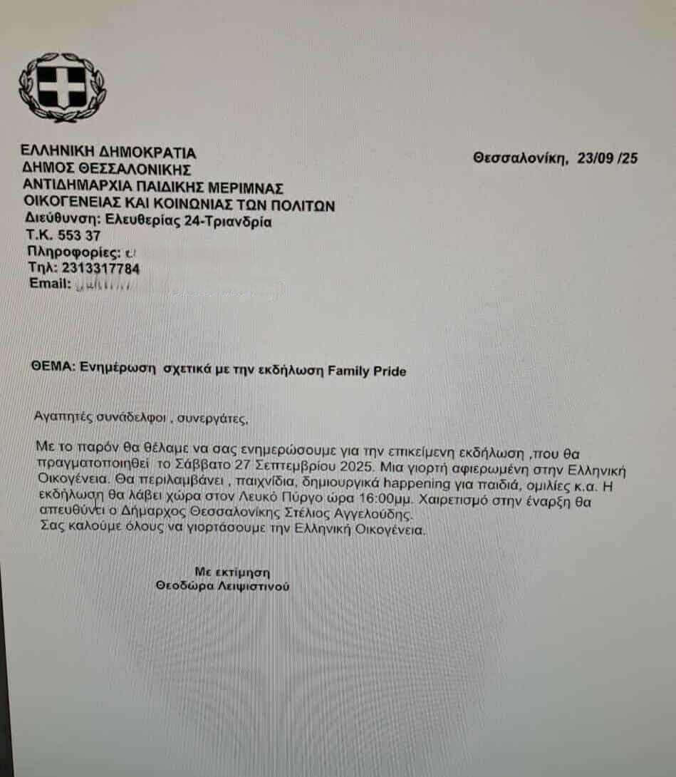 H Αντιδημαρχία παιδικής μέριμνας, οικογένειας και κοινωνίας των πολιτών με επίσημο έγγραφό, που έχουμε στη διάθεσή μας, ενημέρωνε τις προηγούμενες μέρες για την πραγματοποίηση της εκδήλωσης «Family Pride» καλώντας ταυτόχρονα στο εορτασμό της «Ελληνικής Οικογένειας» το Σάββατο 27 Σεπτεμβρίου στις 16.00 στον Λευκό Πύργο. Το mail αυτό έφτασε σε παιδικούς σταθμούς του Δήμου Θεσσαλονίκης και αντίστοιχα ενημερώθηκαν και γονείς και κηδεμόνες των οποίων τα παιδιά φοιτούν εκεί.