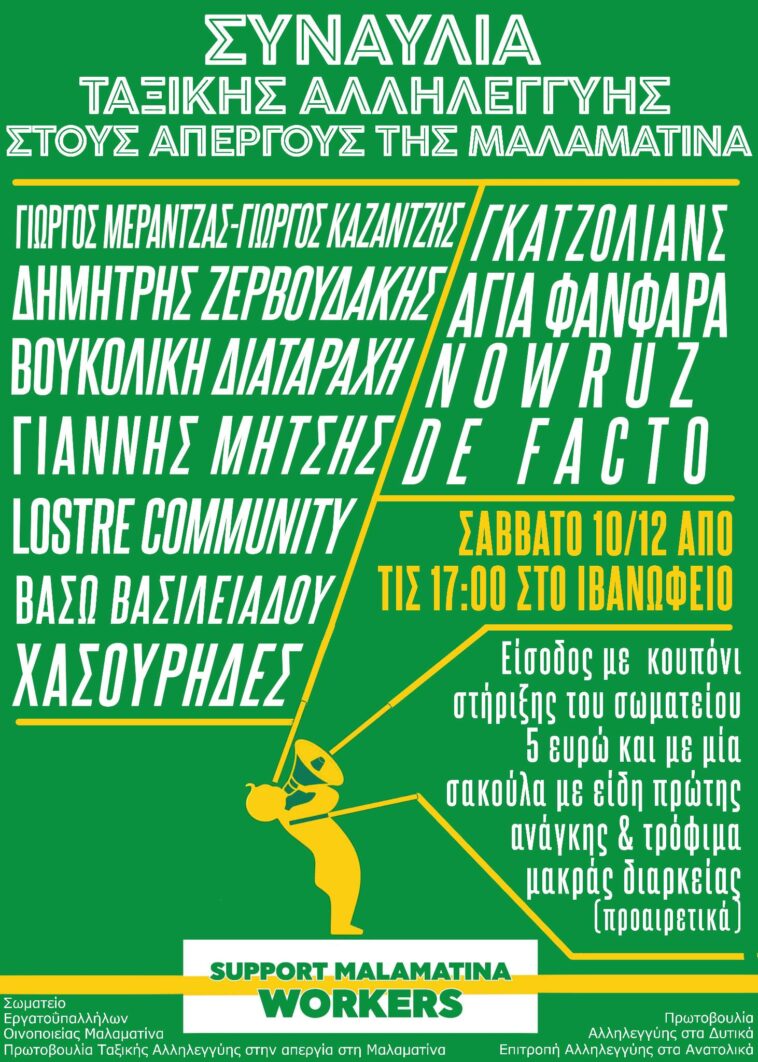 Το Σωματείο Εργατοϋπαλλήλων της Οινοποιείας Μαλαματίνα, η Πρωτοβουλία Αλληλεγγύης στα Δυτικά, η Επιτροπή Αλληλεγγύης στα Ανατολικά και η Ταξική Πρωτοβουλία Αλληλεγγύης στην απεργία στη Μαλαματίνα συνδιοργανώνουν μεγάλη συναυλία ταξικής αλληλεγγύης στους απεργούς της Μαλαματίνα.