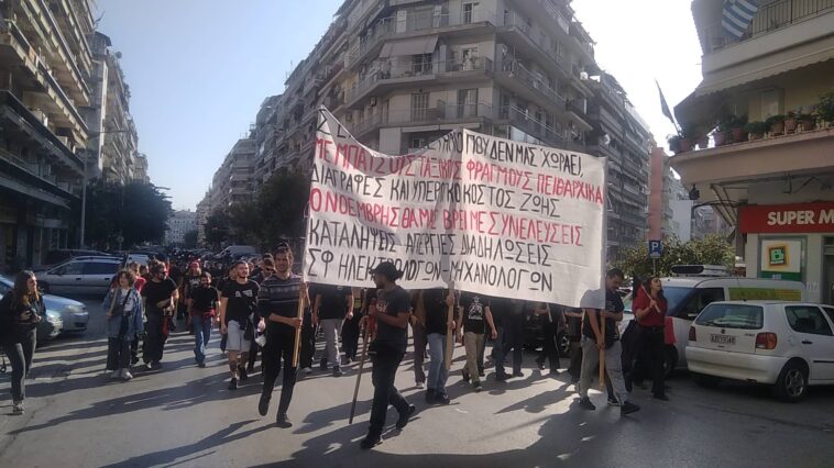 Οι φοιτητές και οι φοιτήτριες από αυτόνομα σχήματα του ΑΠΘ φώναξαν συνθήματα ενάντια στην πανεπιστημιακή αστυνομία αλλά και ενάντια στην επισφαλή εργασία: «Όχι παιδεία για λίγους και εκλεκτούς αγώνα ενάντια στους ταξικούς φραγμούς». Η διαδήλωση ξεκίνησε από την Καμάρα όπου και κατέληξε.
