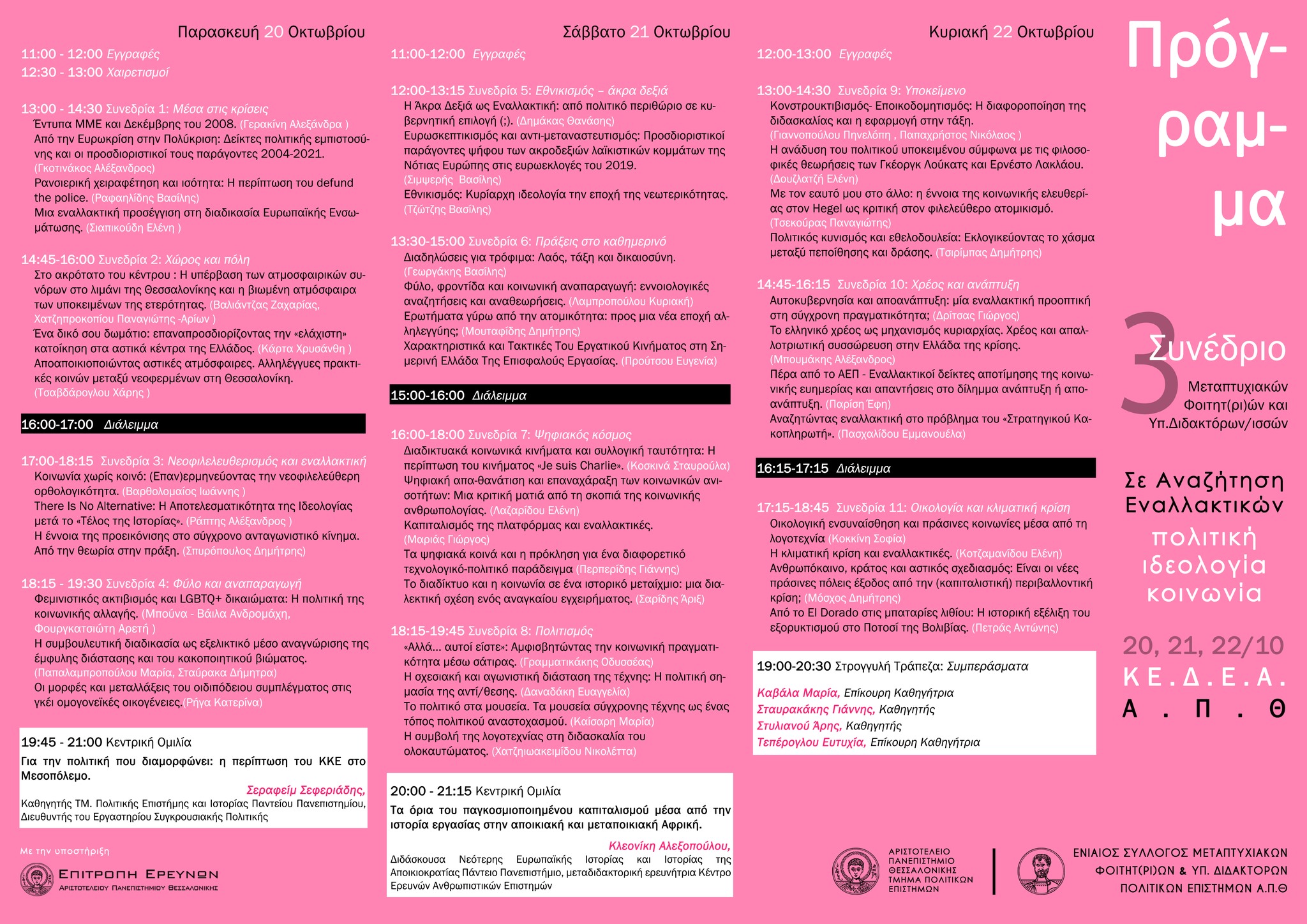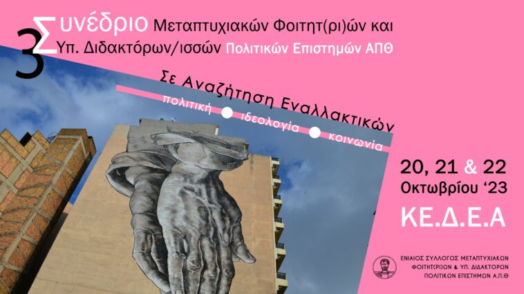Ο Ενιαίος Σύλλογος Μεταπτυχιακών Φοιτητ(ρι)ών και Υποψηφίων Διδακτόρων και Διδακτορισσών του Τμήματος Πολιτικών Επιστημών του Αριστοτελείου Πανεπιστημίου Θεσσαλονίκης διοργανώνει τις επόμενες ημέρες το 3ο του Πανελλήνιο Συνέδριο: «Σε αναζήτηση εναλλακτικών: πολιτική, ιδεολογία, κοινωνία».