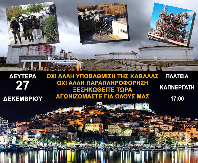 Ως απάντηση στην κρατική καταστολή αλλά και στην στάση της Energean, αύριο, Δευτέρα 27 Δεκεμβρίου στις 17.00 στο Άγαλμα του Καπνεργάτη στην πόλη της Καβάλας θα πραγματοποιηθεί μεγάλο συλλαλητήριο διαμαρτυρίας.