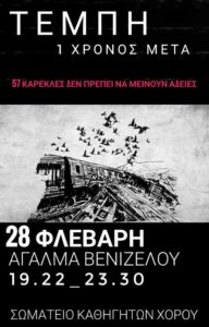 Ένας χρόνος συμπληρώνεται στις 28 Φλεβάρη του 2024 από το έγκλημα των Τεμπών. Ένας χρόνος που οι υπεύθυνοι της τραγωδίας δεν έχουν λογοδοτήσει για τις εγκληματικές τους ενέργειες που οδήγησαν 57 συμπολίτες μας στον θάνατο ενώ παράλληλα τίποτα ριζικό δεν έχει αλλάξει στο δίκτυο του ΟΣΕ για την ομαλή λειτουργία του.