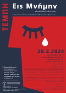 Το απόγευμα της Τετάρτης θα πραγματοποιηθούν δύο πολιτιστικά δρώμενα στη Θεσσαλονίκη. Θέλοντας να μνημονεύσουμε τα θύματα του τραγικού σιδηροδρομικού δυστυχήματος των Τεμπών, και ιδιαιτέρως τους νεκρούς φοιτητές μας, το 5ο Εργαστήριο Ζωγραφικής, του Τμήματος Εικαστικών και Εφαρμοσμένων Τεχνών, της Σχολή Καλών Τεχνών του Α.Π.Θ., καλεί τους πολίες της Θεσσαλονίκης να παραβρεθούν στο εικαστικό δρώμενο “Εις Μνήμην-Μνήμη ενάντια στην λήθη” το οποίο θα πραγματοποιηθεί την ακριβή ώρα της σύγκρουσης των τρένων την Τετάρτη 28 Φεβρουαρίου 2024, με ώρα προσέλευσης 22.40.