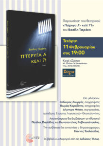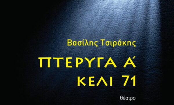 Την Τετάρτη 11 Φεβρουαρίου στις 7:00 μ.μ., στο καφέ Ζώγια (Σβώλου 54), παρουσιάζεται το θεατρικό έργο του Βασίλη Τσιράκη «Πτέρυγα Α ΄- Κελί 71», που κυκλοφορεί από τις εκδόσεις Τόπος.