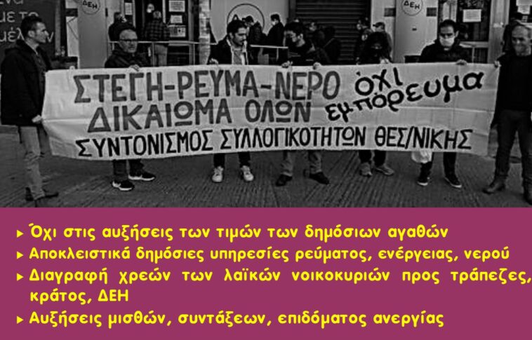 «Ρεύμα και θέρμανση δεν είναι εμπορεύματα, ανήκουν στο λαό!» αναφέρει σε ανακοίνωσή του ο Συντονισμός Συλλογικοτήτων Θεσσαλονίκης καλώντας σε συγκέντρωση ενάντια στις ανατιμήσεις, την ακρίβεια και το αυξημένο κόστος ζωής, την Τετάρτη 15 ΔΕκεμβρίου στις 13.30 στη συμβολή των οδών Τσιμισκή και Αριστοτέλους. Στη συγκέντρωση, μεταξύ άλλων καλεί και ο Ζ’ Σύλλογος Εκπαιδευτικών Π.Ε. Θεσσαλονίκης τονίζοντας ότι τάσσεται ενάντια στις αυξήσεις των τιμολογίων ρεύματος και θέρμανσης και την ακρίβεια σε τρόφιμα και βασικά κοινωνικά αγαθά.