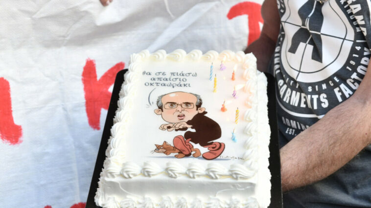 Συγκέντρωση έξω από το υπουργείο Εργασίας πραγματοποίησαν τα κλαδικά σωματεία του Εμπορίου στην Αττική, επιχειρησιακά σωματεία και εργαζόμενοι στον κλάδο. Μάλιστα, αφιέρωσαν μια άλλη τούρτα (όχι αυτή με τον «σούπερμαν» Κωστή Χατζηδάκη) στον υπουργό Εργασίας. Το σκίτσο στην τούρτα είναι του Δημήτρη Γεωργοπάλη.