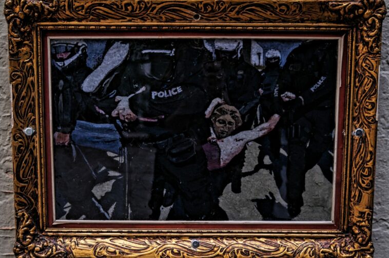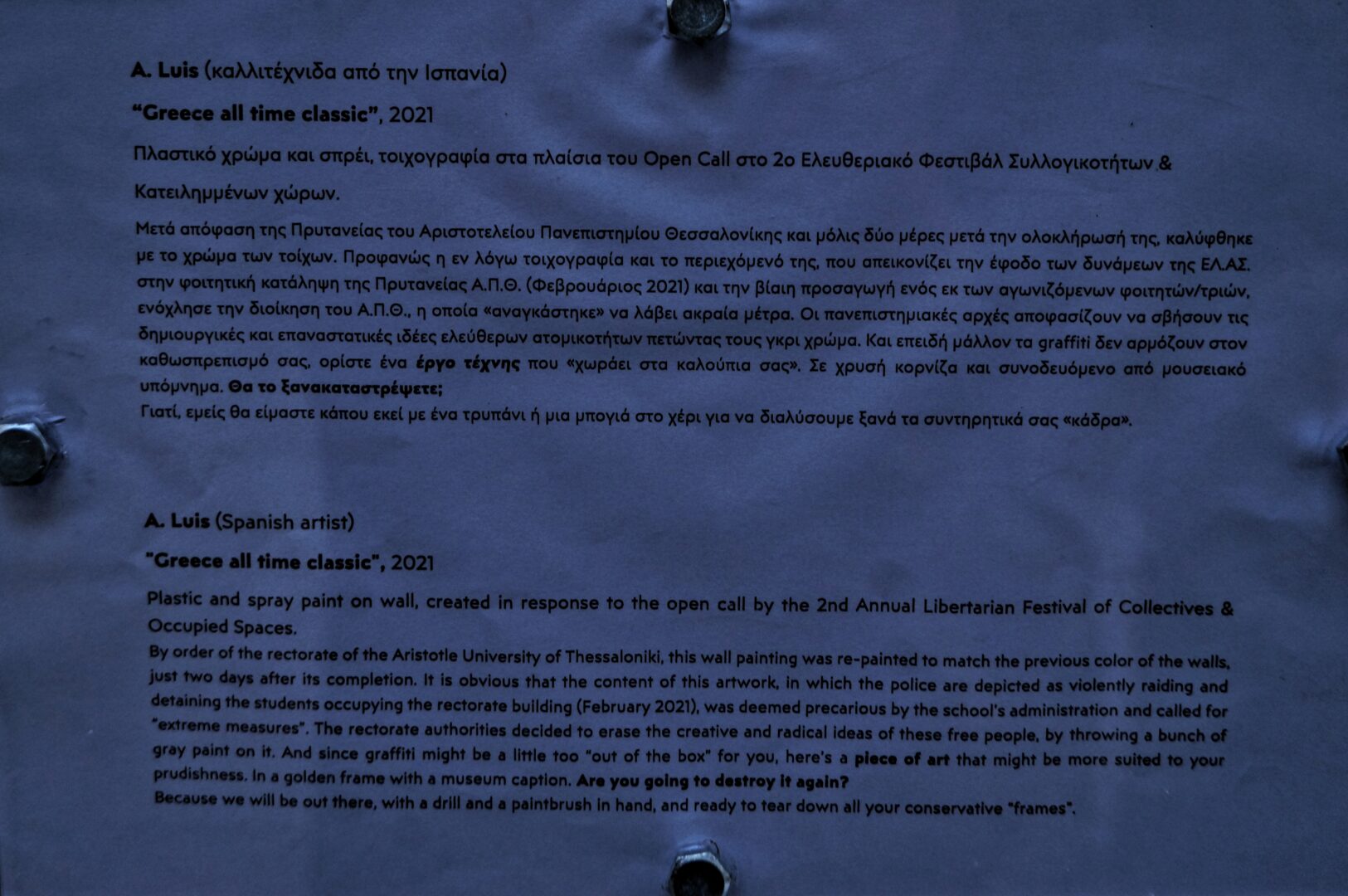 Μετά απόφαση της Πρυτανείας του Αριστοτελείου Πανεπιστημίου Θεσσαλονίκης και μόλις δύο μέρες μετά την ολοκλήρωσή της, καλύφθηκε με το χρώμα των τοίχων. Προφανώς η εν λόγω τοιχογραφία και το περιεχόμενό της, που απεικονίζει την έφοδο των δυνάμεων της ΕΛ.ΑΣ. στην φοιτητική κατάληψη της Πρυτανείας Α.Π.Θ. (Φεβρουάριος 2021) και την βίαιη προσαγωγή ενός εκ των αγωνιζόμενων φοιτητών/τριών, ενόχλησε την διοίκηση του Α.Π.Θ., η οποία «αναγκάστηκε» να λάβει ακραία μέτρα. Οι πανεπιστημιακές αρχές αποφασίζουν να σβήσουν τις δημιουργικές και επαναστατικές ιδέες ελεύθερων ατομικοτήτων πετώντας τους γκρι χρώμα. Και επειδή μάλλον τα graffiti δεν αρμόζουν στον καθωσπρεπισμό σας, ορίστε ένα έργο τέχνης που «χωράει στα καλούπια σας». Σε χρυσή κορνίζα και συνοδευόμενο από μουσειακό υπόμνημα. Θα το ξανακαταστρέψετε;