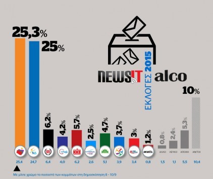 Σε δημοσκόπηση της Alco για λογαριασμό του «newsit.gr», στην πρόθεση ψήφου, ο ΣΥΡΙΖΑ συγκεντρώνει 25,3% έναντι 25% της Ν.Δ., ενώ η Χρυσή Αυγή έπεται στο 6,2%.