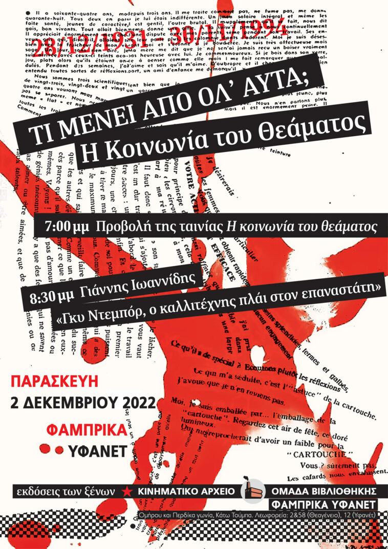 Η Ομάδα βιβλιοθήκης, βιβλιοπωλείου και κινηματικού αρχείου Φάμπρικας Υφανέτ μαζί με τις εκδόσεις των ξένων διοργανώνουν προβολή και συζήτηση με θέμα: «Τι μένει από όλ’ αυτά; Η κοινωνία του θεάματος»
