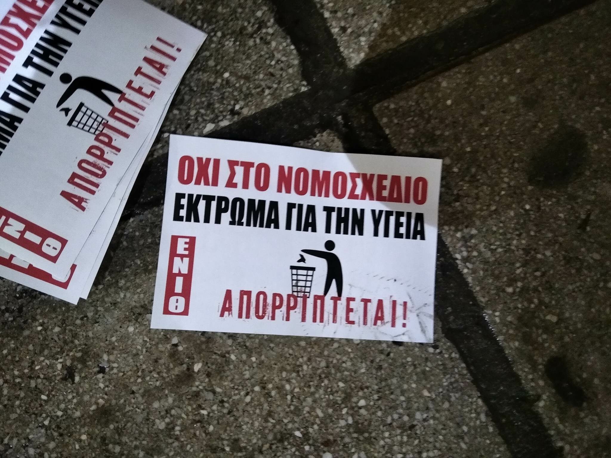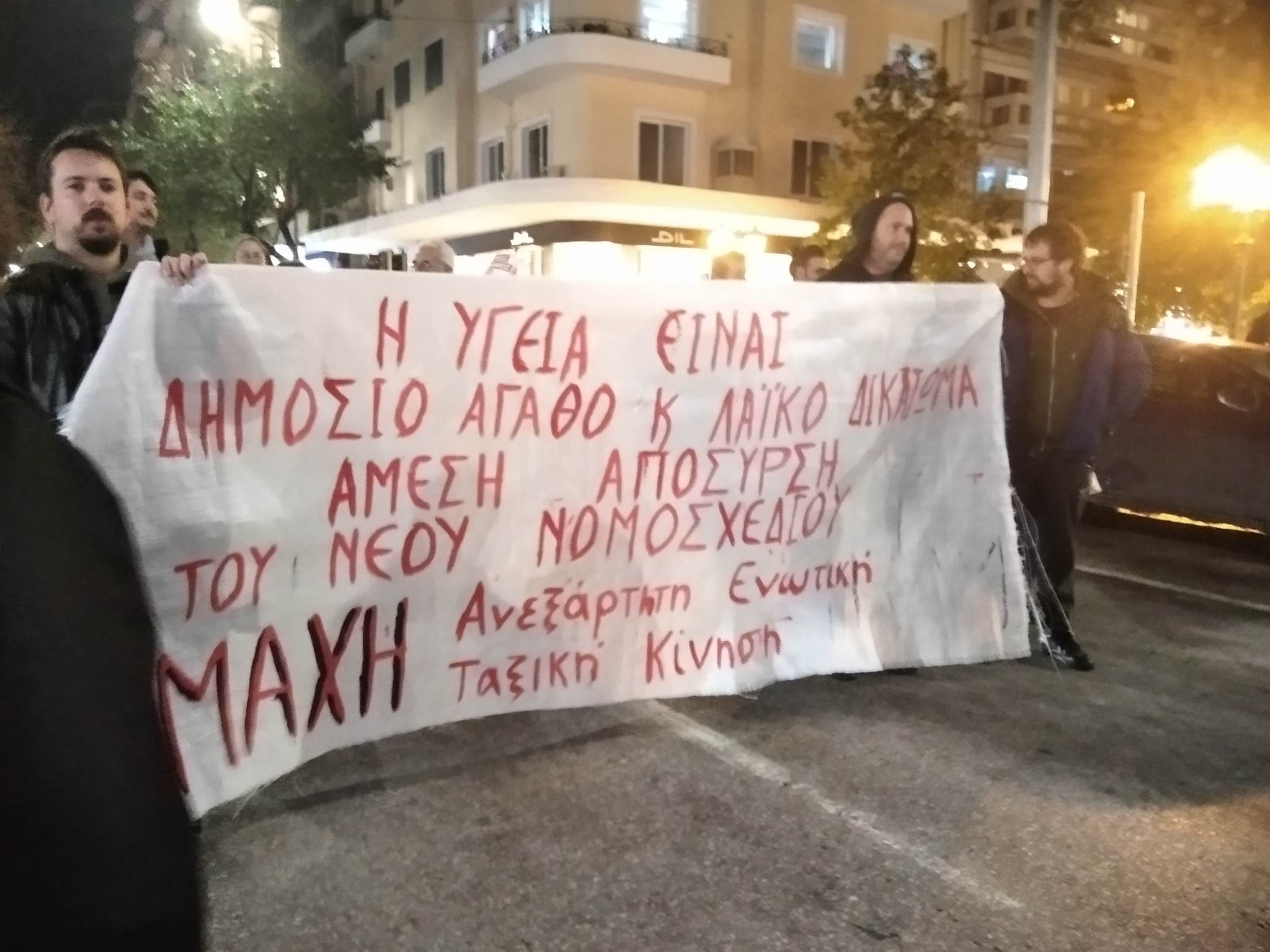 «Οι νοσοκομειακοί γιατροί, οι υγειονομικοί της πόλης συνολικά αντιδρούν και καταδικάζουν το νομοσχέδιο έκτρωμα για την υγεία, που καταργεί την πλήρη και αποκλειστική απασχόληση των γιατρών και υποσκάπτει τα θεμέλια του δημόσιου συστήματος υγείας και αναγκάζει τους ασθενείς να βάζουν πιο βαθιά το χέρι στην τσέπη» δήλωσε ο πρόεδρος της ΕΝΙΘ Χρήστος Καραχρήστος τονίζοντας ότι με τις ρυθμίσεις του νομοσχεδίου εκβιάζονται οι νοσοκομειακοί γιατροί να λεηλατήσουν τις τσέπες των ασθενών για να αυξήσουν το εισόδημά τους γιατί η κυβέρνηση είναι αποφασισμένη να μην κάνει πράξη τις αποφάσεις του ΣτΕ για αύξηση των μισθών και των αντισυνταγματικών περικοπών στο ιατρικό μισθολόγιο. «Καταδικάζουμε αυτό το νομοσχέδιο, δε θα περάσει στην πράξη, οι νοσοκομειακοί γιατροί με τις αποφάσεις των Ενώσεών τους και των Ιατρικών συλλόγων της Ελλάδας είναι ενάντια σε αυτό το νομοσχέδιο» πρόσθεσε ακόμη καλώντας. τους εργαζόμενους «να στηρίξουν τον αγώνα και το επόμενο διάστημα για να διεκδικήσουμε να μην περάσει το νομοσχέδιο να μην εφαρμοστεί στην πράξη και να ενισχυθεί το ΕΣΥ με μαζικές προσλήψεις και αυξήσεις τους μισθούς».Η διαδήλωση ξεκίνησε από το άγαλμα Βενιζέλου και κατέληξε στην 3η ΥΠΕ στην Αριστοτέλους.