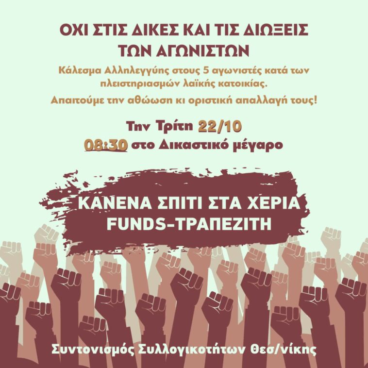 Μετά από δύο συνεχείς διακοπές που επέβαλε η δικαστική έδρα στις 8 και 9 του Οκτώβρη, επαναλαμβάνεται την Τρίτη 22 Οκτωβρίου η δίκη των 5 μελών του Συντονισμού Συλλογικοτήτων Θεσσαλονίκης και του κινήματος κατά των πλειστηριασμών λαϊκής κατοικίας.