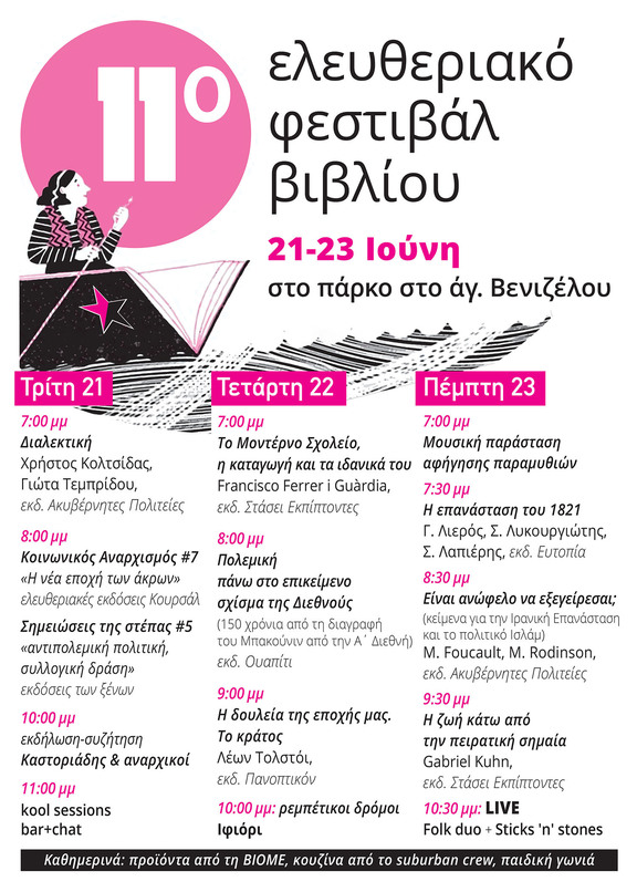 Στις 21 Ιουνίου ξεκινάει το 11ο Ελευθεριακό Φεστιβάλ Βιβλίου με πλήθος εκδηλώσεων και συζητήσεων. Το φεστιβάλ που θα πραγματοποιηθεί στο πάρκο στο άγαλμα Βενιζέλου στη Θεσσαλονίκη θα διαρκέσει μέχρι την Πέμπτη 23 Ιουνίου.