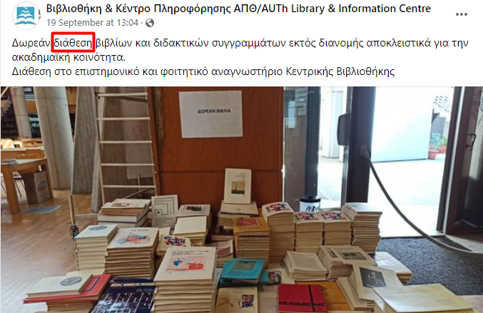 Στην βιβλιοθήκη Μεταπτυχιακών και Υποψηφίων Διδακτόρων μέσα στην οποία τραβήχτηκε η φωτογραφία, δεν λειτουργεί υπηρεσία «ανταλλαγής» βιβλίων, αλλά υπηρεσία διάθεσης βιβλίων, όπως μαρτυρά η ανακοίνωση που επισυνάπτουμε, η οποία δημοσιεύτηκε στις 19 Σεπτεμβρίου. Το ότι δεν βλέπετε τη λέξη «ανταλλαγή» στη δημοσίευση δεν είναι γιατί κάποιος ξέχασε να την βάλει. Είναι γιατί δεν υπήρχε ανταλλαγή.