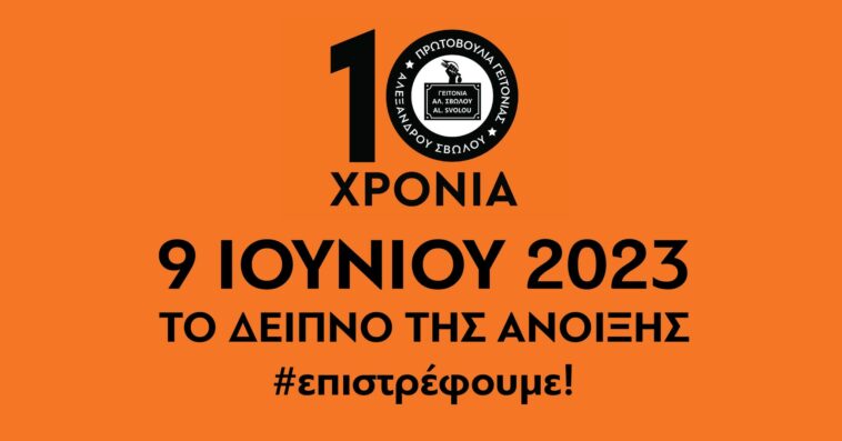 Η Πρωτοβουλία Γειτονιάς Αλεξάνδρου Σβώλου γιορτάζει τα 10 χρόνια δράσεων και προετοιμάζει το 8ο Δείπνο της Άνοιξης, την Παρασκευή 9 Ιουνίου 2023 στις 18:00.