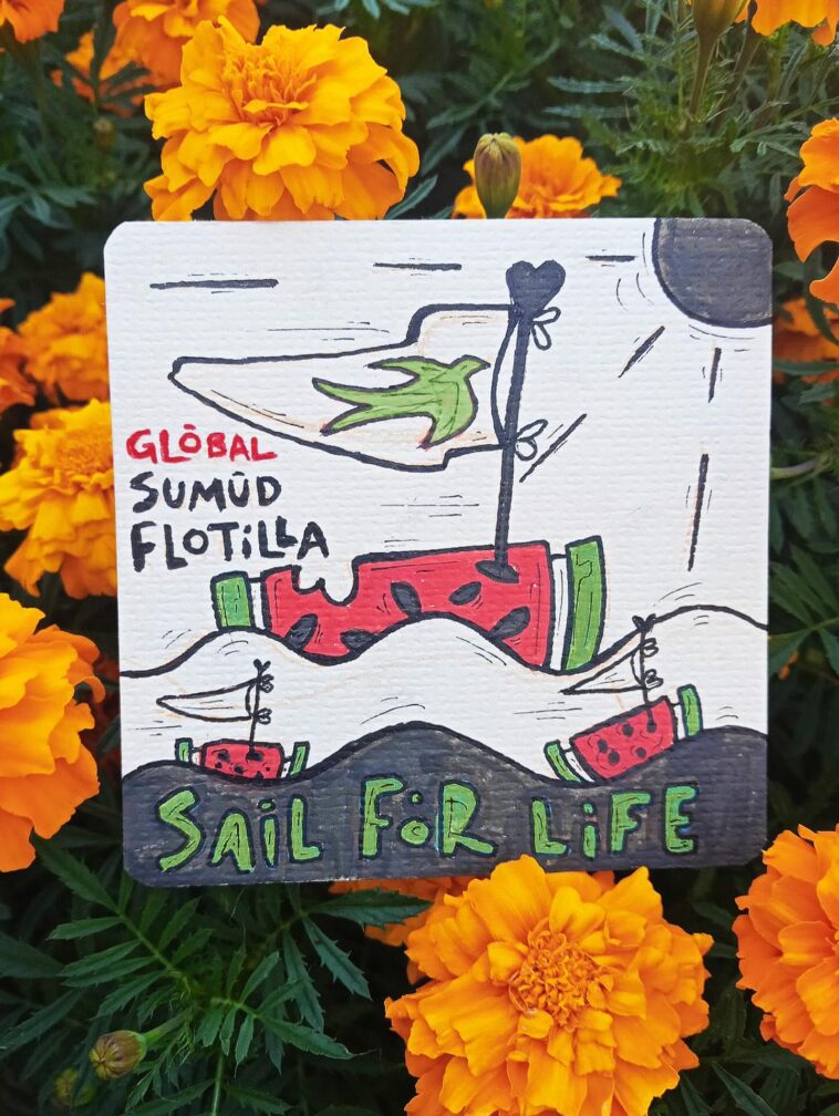 «Από τη Σύρο στη Γάζα, από την Ελλάδα στην Παλαιστίνη: σαλπάρουμε για να σπάσει ο αποκλεισμός, να σταματήσει η γενοκτονία, να ακουστεί ξανά δυνατά η φωνή ενός λαού που αγωνίζεται για ζωή, δικαιοσύνη και ελευθερία».
