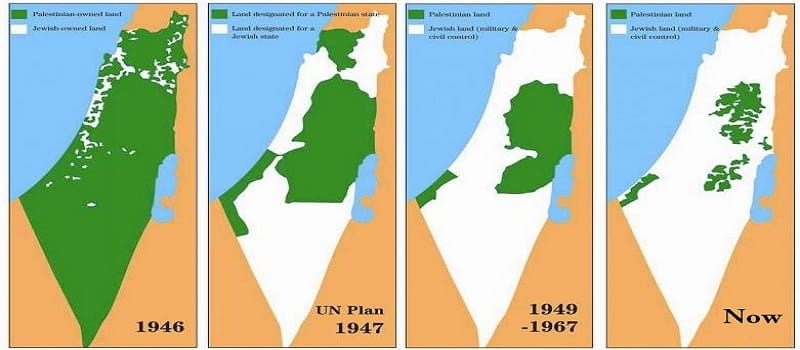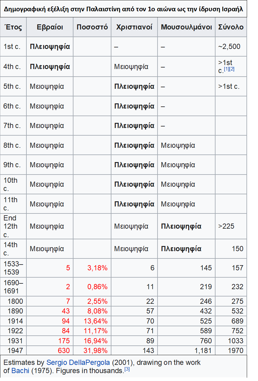 Δείτε εκτός από την εικόνα της δημογραφικής εξέλιξης ως το 1947 στον Πίνακα και το σταδιακό, βίαιο εποικισμό των Παλαιστινιακών εδαφών μετά την ίδρυση του Ισραήλ στην παρακάτω εικόνα.